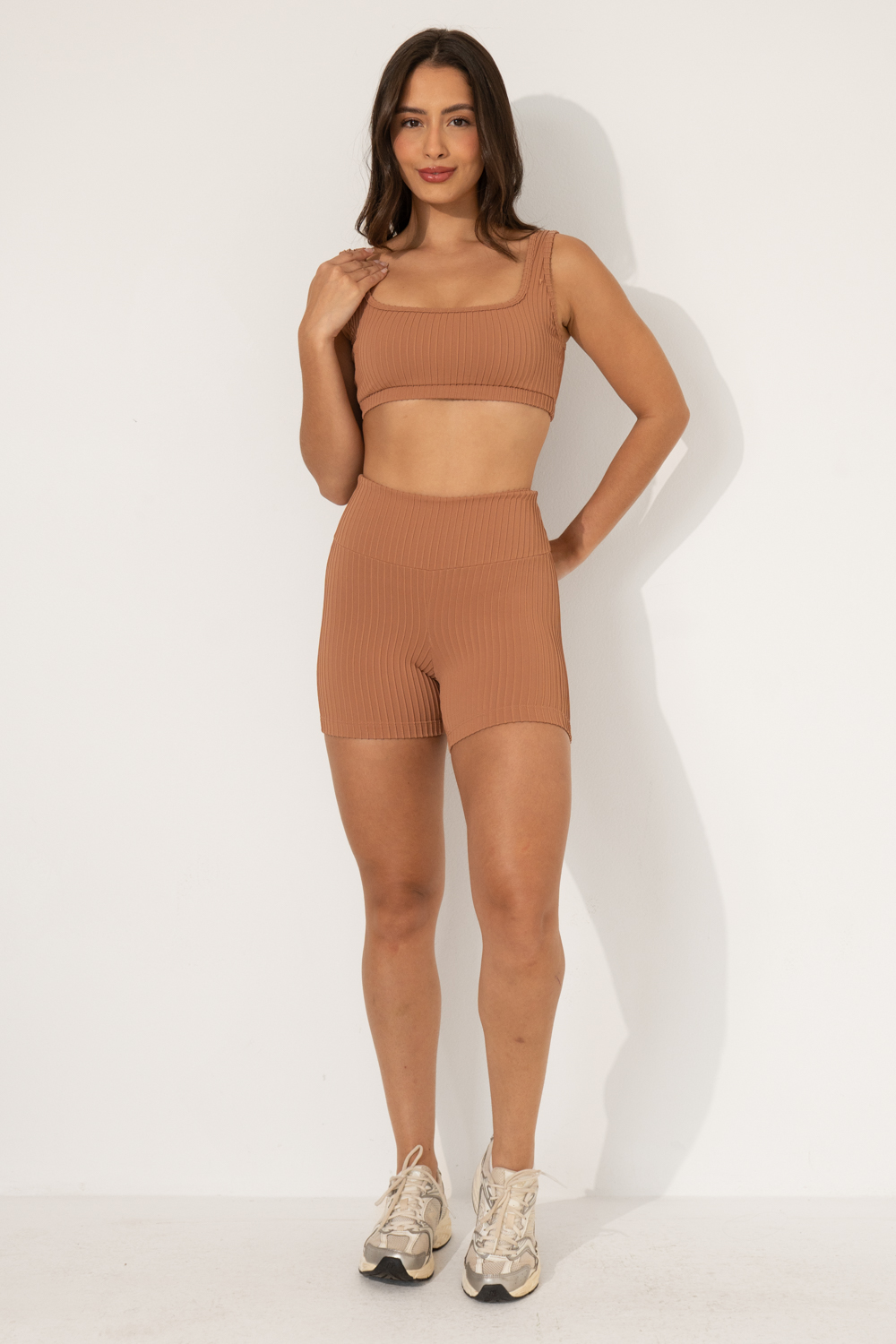 Seu grande destaque é o tecido canelado: moderno, super confortável e com efeito que valoriza a silhueta, ajudando a camuflar imperfeições de forma natural. Com modelagem anatômica e cós alto, garante um encaixe firme e confortável na medida certa. O comprimento meia coxa traz mais segurança e não sobe durante os exercícios.